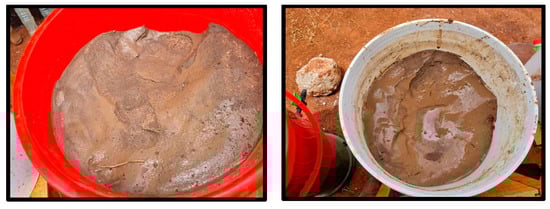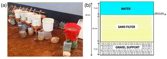 SSF systems were assembled using local material, including a bucket with a faucet at the bottom, into which gravel/small stones and sand were placed (Figure 3a,b). Common sand and stones found in the area were used (stones suitable for sedimentation and coarse sand). The sand was composed of fine to medium-sized particles, typically ranging between 0.1 mm and 1 mm. The gravel consisted of irregularly shaped, coarse stones ranging in size from approximately 0.5 cm to 3 cm, providing a rough texture and varied particle sizes (Figure S6).