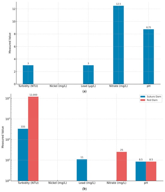 The Sokoru Dam (Figure 1) showed extremely high turbidity levels (335 NTU) and lead concentration (11 mg/L), both significantly exceeding WHO/EPA limits, indicating severe water quality issues. Nitrate and pH levels were within acceptable limits, but the overall water quality necessitated substantial intervention (Table S2). The presence of lead at these concentrations poses a significant threat and substantial health risks. Regulatory bodies, such as the U.S. Environmental Protection Agency (EPA) and WHO, have set stringent standards for lead in drinking water. The EPA’s action level for lead in drinking water is 0.015 mg/L (15 ppb) [16], and WHO allows 0.01 mg/L (10 ppb) [17], significantly lower than the 11 mg/L levels found in the reservoir.