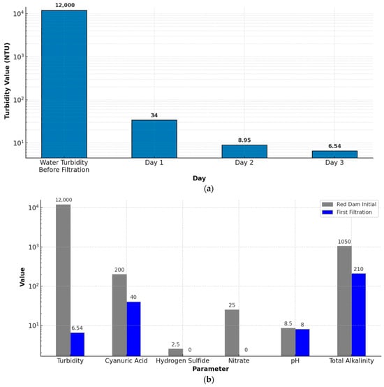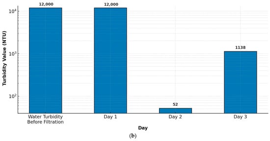 Over four days, System 4 showed a consistent decrease in turbidity values (Figure 8a). Starting from 12,000 NTU on Day 1, the turbidity dropped significantly to 1450 and 123 NTU on Day 2. By Day 3, the value was further reduced to 30 NTU. On Day 4, the turbidity values decreased, recording 465 NTU, 35.6 NTU, and 25.6 NTU in successive repetitions (Figure S4). This indicates effective filtration, with the system efficiently reducing the number of suspended particles in the water over time.
