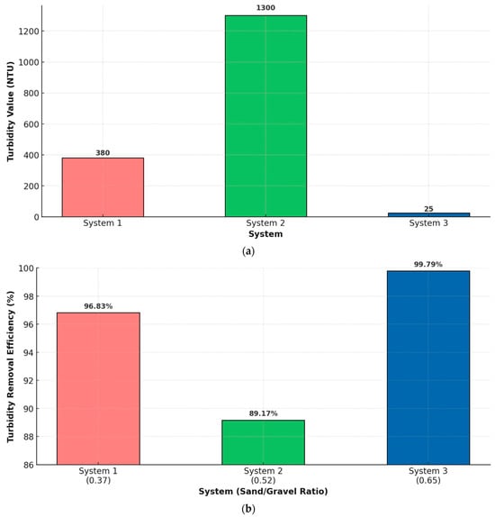 (a) Comparison of turbidity values after one day (the value shown for each system is the system’s lowest recorded); (b) comparison of turbidity removal efficiency after one day.