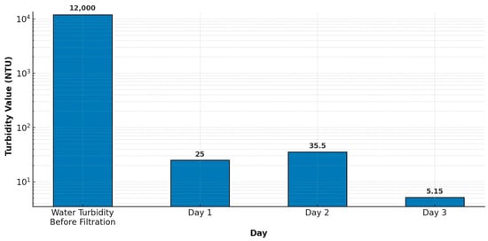 The results show significant reductions in turbidity across all three systems, with varying degrees of effectiveness. System 1 shows a rapid and substantial decrease in turbidity values, quickly dropping from 12,000 NTU to much lower levels within a few repetitions, indicating high filtration efficiency. System 2 also demonstrates a sharp reduction in turbidity, effectively lowering the values from 12,000 NTU to minimal levels, though with slight variations. System 3 is the most efficient, achieving the greatest reduction in turbidity (Figure S3). It consistently reduces the turbidity from 12,000 NTU to much lower levels, demonstrating superior filtration performance. Due to its superior performance, the gravel–sand ratio from System 3 was adopted for subsequent systems. Further tests were conducted to evaluate its water purification capabilities in the following days (Figure 7).
