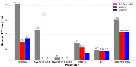 In addition, several primary contaminants were tested (Figure 9). Results show water quality parameters between the Red Dam, System 4, and System 5 after filtration. The parameters include turbidity, cyanuric acid, nitrate, hydrogen sulfide, pH, and total alkalinity. The results present a prominent decrease in the tested parameters.