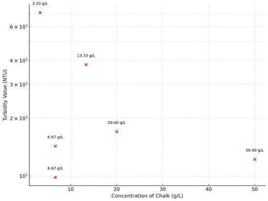 Figure 11 illustrates the relationship between chalk (CaCO3) concentration and turbidity levels in water, revealing that turbidity is at its lowest when the chalk concentration is in the 6.67 g per liter range. This suggests that this concentration is optimal for sedimentation processes designed to reduce turbidity among the tested concentration. However, when the chalk concentration increases, turbidity levels begin to rise again, possibly due to particle re-stabilization that reduces the efficiency of the sedimentation process.