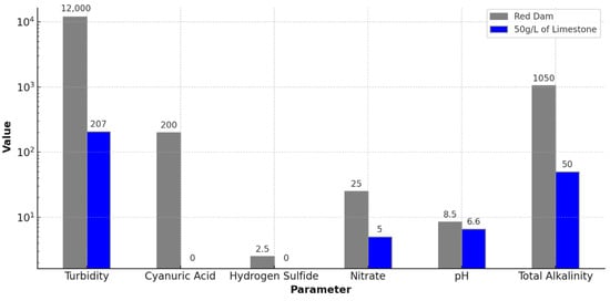 The Red Dam also presented severe water quality problems, with an extremely high turbidity of 12,000 NTU, indicating extreme contamination. Hydrogen sulfide at 2.5 mg/L and Cyanuric acid at high concentrations (200 mg/L) also harm aquatic lifeforms (Table S3). Overall, the compounds found necessitated comprehensive treatment. Lead was not detected, which is positive, but overall water quality issues required significant remediation (Figure 4).