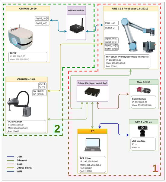 Figure 1. Communication diagram for integration of robotic station UR5: 1—quality control station; 2—cobot station cooperating with other robots (stationary i4-550L, mobile LD-90) from the robotic line.