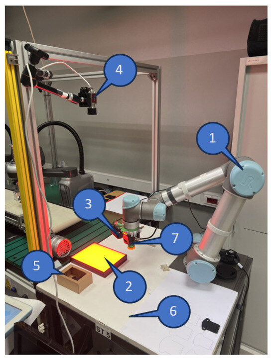 Figure 2. Layout of the cobot station: 1—UR5 CB2 cobot; 2—illuminator (backlight lighting); 3—Savio CAK-01 USB webcam camera; 4—Mako G-125B camera; 5—container where defective parts are rejected; 6—space warehouse; 7—piCOBOT vacuum ejector.