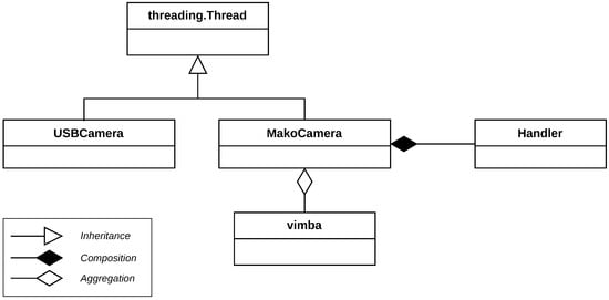 The station’s operating algorithm was divided into a few processes related to image acquisition, data exchange with the cobot and analysis of the captured image. According to the diagram presented in Figure 4, the MakoCamera class inherits from the threding.Thread class in order to work as an independent thread.