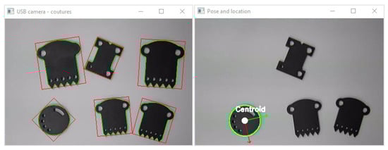 Step 2—after receiving the signal (digital_in0), semi-finished products are grasped by the UR5 cobot and transferred to the measuring section (Figure 2, ‘2’). (The position and orientation of objects are determined based on images acquired from the USB camera placed on the cobot’s flange, Figure 2 and Figure 6).
