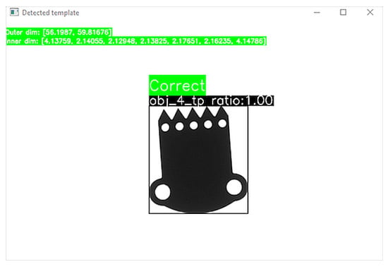 Figure 7. The result of the deployed vision measurement tool. The semi-finished product meets all the criteria; the object has been recognized; all dimensions are within the accepted tolerances (screenshot of running vision app v.03, the ‘inner dim’ section refers to the length of the inner hole radius; the ‘outer dim’ section refers to the external dimensions of width and height of the part).
