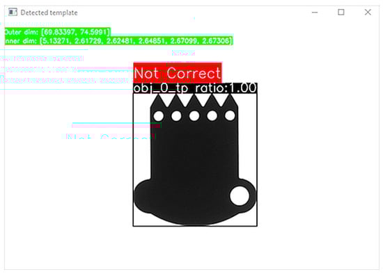 Figure 8. The semi-finished product does not meet the accepted criteria: the object has been recognized and the dimensions are within the accepted tolerances, but one of the holes is missing (screenshot of running vision app: the ‘inner dim’ section refers to the length of the inner hole radius; the ‘outer dim’ section refers to the external dimensions of width and height of the part).