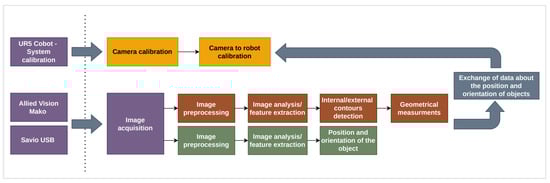 The developed vision-based measurement software tool contains the following modules: image acquisition, camera and camera-to robot calibration, image preprocessing and analysis and communication (Figure 9).