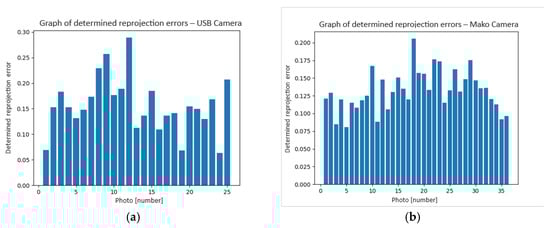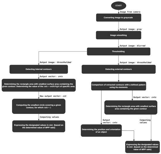 Vision measurements enable the determination of objects’ geometric features [14,22,23,24,25]. An example of such applications in identifying image features is presented [26], where an original algorithm based on the ORB (Oriented Fast and Rotated Brief) algorithm concerning image processing on FPGA systems is also discussed. Another work [27] focuses on assessment using SIFT and SURF feature detectors for analyzing underwater images. The work [28] addresses using Fast R-CNNs (Fast Region-Based Convolutional Neural Network) to develop a waste identification system in a garbage-sorting plant. The system is complemented by a robotic line that performs the sorting process. The area of application of vision systems in robotics employing image processing methods is the automated identification of positions of workcell components with Aruco markers and OpenCV library [29]. Another group of works covering the issue of using vision systems in robotics are applications built based on the ROS (Robot Operating System) environment engaging OpenCV libraries and C++ or Python languages [30,31,32,33,34,35,36,37].