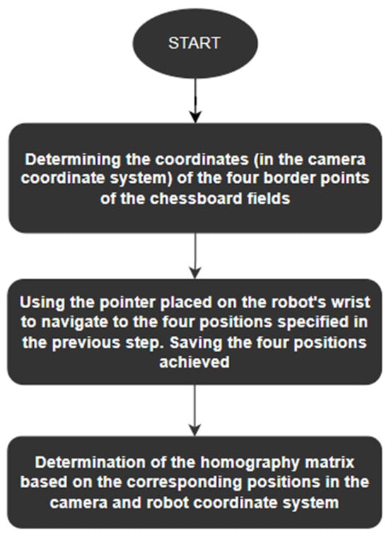The main purpose of the camera calibration process is to determine the internal and external parameters of the camera [8,9,10,11,12]. The need to carry out the calibration process is mainly related to the necessity to remove distortions introduced by the camera’s optical path, the possibility of making measurements in SI units, and to obtain the model and position of the camera with reference to the given coordinate system [8,9,10,11,13]. System calibration is the most crucial step in a vision-based measurement system and is essential when metric data are required [10,14]. Calibration of a camera with a robot [11,12,13,15] can be classified as eye-to-hand (camera placed on the station) and eye-in-hand (camera mounted on the robot). As a result of the calibration procedure, a transformation is obtained that maps the system from the camera’s image space to the coordinate system associated with the robot [11,12,13,15,16].