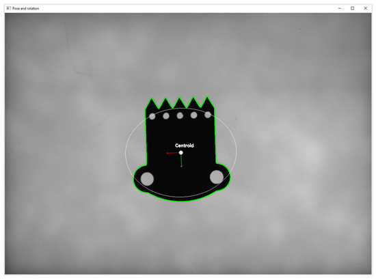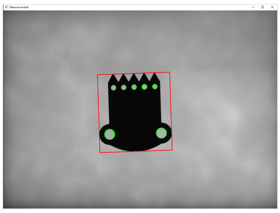Step 3—in the measurement area, based on the image from the Mako G-125B camera, the semi-finished product is detected, and its dimensions (width and height) and the radius of internal holes are measured. Sample analysis results are presented below (Figure 7) (the dimensions of internal holes are ordered relative to the designated X and Y coordinates of their centroid in descending order, and external dimensions are presented as width and height).