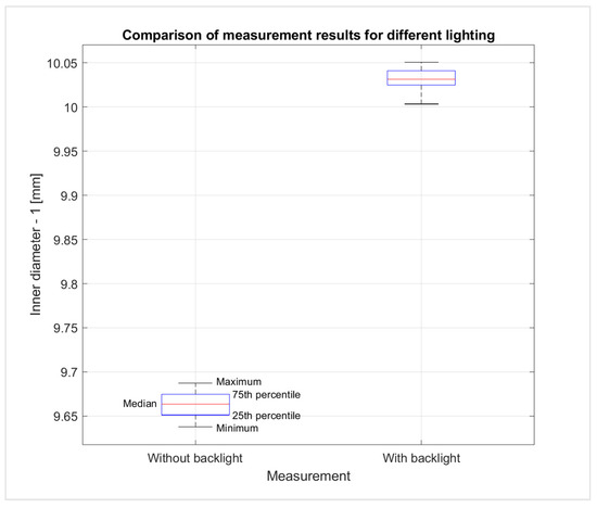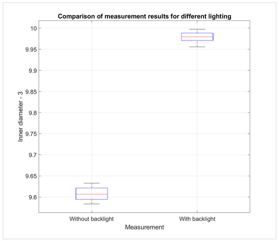 Comparing the results obtained while both using backlight lighting and then not using it, a significant improvement in measurement accuracy can be noticed. For the case of no backlight lighting, the average accuracy is estimated at 0.325 mm; for the backlight illumination system, this is 0.031 mm.