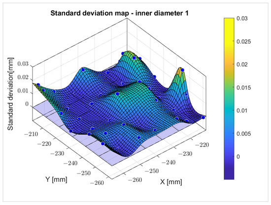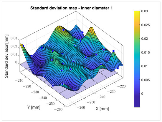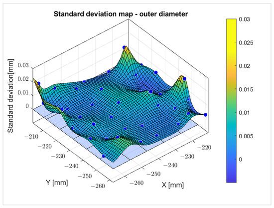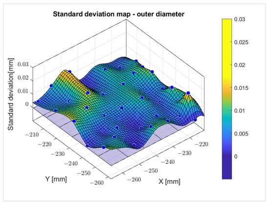 Figure 22. Map of the standard deviation of the outer diameter of the workpiece (without backlight lighting). Blue dots—measured values.