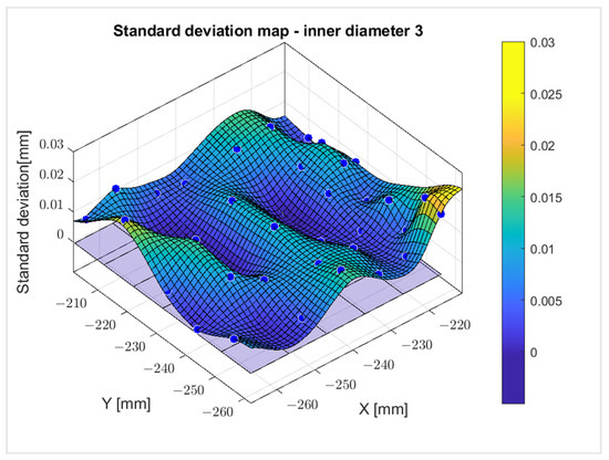 Figure 25. Standard deviation map of workpiece outer diameter (backlight lighting). Blue dots—measured values.