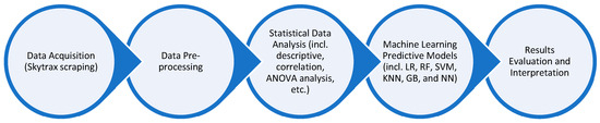 This study utilizes a dataset comprising approximately 7500 reviews sourced from Skytrax, a renowned platform for airline and airport reviews. It leverages the SOAP API in Python 3.1 to gather data spanning mainly from 2015 to 2024, with a small proportion extending back to even earlier years. In the data, each review has a variety of features including terminal cleanliness, terminal seating, terminal signs, food and beverages, airport shopping, WiFi connectivity, and airport staff. Additionally, each review is associated with a binary classification target variable, indicating whether the reviewer recommends the airport. The predictive analysis pipeline is shown in Figure 1.