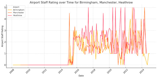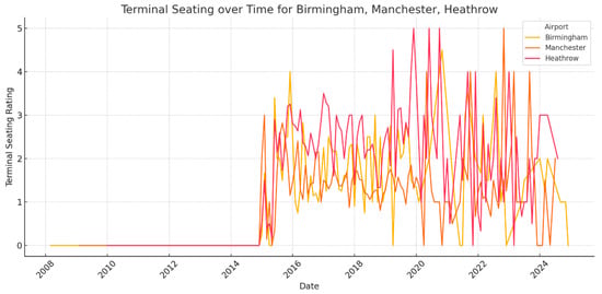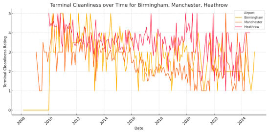 To identify any temporal patterns or shifts in factors influencing recommendations, time series analysis was applied to examine trends and fluctuations over time in the passengers’ satisfaction, recommendations, and airport feature ratings. This could involve seasonal trends, changes due to airport improvements, or responses to specific events. Understanding these trends can help airport management identify areas needing improvement and track the impact of changes or interventions over time. It is evident that passengers’ ratings for various airport-related services or aspects (incl. terminal cleanliness, seating, signage, food and beverages, shopping, WiFi connectivity, and airport staff) vary throughout the year. As examples, Figure 2, Figure 3 and Figure 4 illustrate these variations for Heathrow, Birmingham, and Manchester airports by aspect, with similar patterns observed at other airports. This indicates that the quality of these aspects changes over time, likely influenced by seasonal effects and the number of passengers served. However, further investigation is necessary for hidden factors impacting the variation.