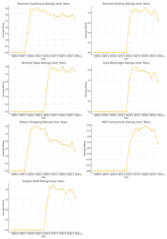 The time series study in descriptive analysis indicates that the quality of airport services changes over time, with passengers showing more negative ratings in recent years compared to the past for all airport services. However, it must be noted that a significant number of passengers have not rated all elements of the evaluation matrix provided by Skytrax. Furthermore, the analysis of common keywords in passengers’ reviews reveals several aspects of the airport experience that are not covered by the evaluation matrix but are of significant concern to passengers, such as passenger management and passport control. The correlation analysis between airport features and ratings and the likelihood of an airport being recommended by reviewers indicates a positive correlation at different levels. It also shows the alignment between the sentiment expressed in the passengers’ review words and the numerical ratings. The ANOVA test results suggest that there are statistically significant differences in airport service ratings across years, except for airport shopping in the pre-2019 years. This implies that perceptions, and perhaps the actual quality, of services and facilities at airports are changing over time. This research also employed a logistic regression model to assess the impact of various airport services on the likelihood of an airport being recommended by passengers. The model achieved a weighted average precision of 84%. Terminal cleanliness, airport staff, and airport shopping were identified as the top three factors with a positive impact on the likelihood of an airport being recommended.