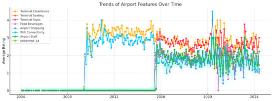 Figure 6 shown below compares the trends of various airport features over time. Terminal cleanliness and airport shopping features show significant variations, suggesting periods of high and low passenger satisfaction. Meanwhile, WiFi connectivity and terminal signs features have relatively stable trends but exhibit occasional spikes or dips, indicating changes in passengers’ experience. The trends for terminal seating, food and beverages, and airport staff also show variability, reflecting changes in passengers’ perceptions over time.