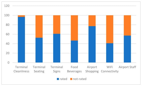 Moreover, it was noticeable that a significant number of passengers have not rated all elements of the evaluation matrix given by Skytrax. Figure 8 below shows that 58.94% of passengers have not given a rating for WiFi connectivity. It is suggested that passengers may be busy with catching flights, with less time to browse the Internet. However, aspects such as staff, food and beverage, terminal seating, and terminal signs were ignored by 42.8%, 53.28%, 47.29%, and 39.02% of passengers, respectively. Accordingly, it is worth digging into passengers’ textual reviews to highlight all aspects that may not be rated in the evaluation matrix.