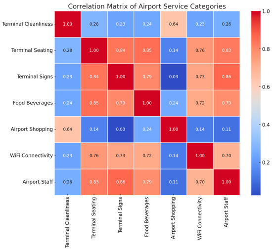 Figure 9 below illustrates the correlations among passengers’ ratings for various airport services or aspects. Three types of correlations were identified: (1) Strong positive correlations (values close to 1) suggest that as one aspect improves, another improves. For instance, the strong correlations between terminal seating, terminal signs, and food and beverages indicate that enhancements in one of these areas may be associated with improvements in the others; (2) Moderate correlations: These are observed between aspects such as airport shopping and WiFi connectivity, suggesting a moderate relationship; (3) Lower correlations (values closer to 0) indicate less direct relationships between these aspects. This implies that improvements in these areas could be managed independently without significant direct impacts on each other. These correlation insights can help airport management prioritize improvements accordingly.