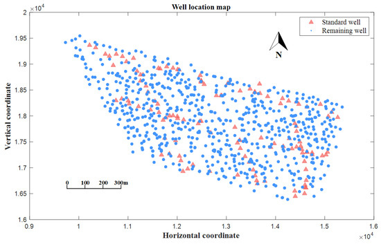 In this experiment, we utilized the well logging data of 906 wells in the study area, depicted in Figure 2, which serves as a well location map, with each point marking a wellbore. The depth of these well logging curves is around 1200 m, with a sampling interval of 0.025 m. Given the variability in well logging data across different wells, the RLLD and RLLS curves were specifically selected for model input. The RLLD and RLLS curves provide high-resolution resistivity measurements, which are valuable for understanding stratigraphic structure, lithologic identification, stratigraphic studies, and hydrocarbon exploration.