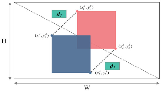 Here, (A,B) represents the real box and the prediction box, respectively, represents the upper left corner of the rectangular box, represents the lower right corner of the rectangular box, and represents the width and height of the input picture, as shown in Figure 4. LMDPIOU represents the MPDIOU loss function.