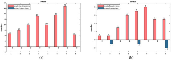 Comparison chart of model multiple detections and missed detections: (a) the number of multiple detections and missed detections of stratigraphic intervals by the YOLOv8x model and (b) the number of multiple detections and missed detections of stratigraphic intervals by YOLOv8x-CAMDP.