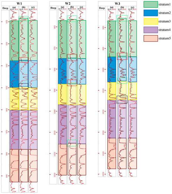 In this study, the vertical distribution of adjacent strata is continuous. In the model prediction results, on the basis that the predicted stratigraphic categories are consistent with the actual stratigraphic sequence, if the top and bottom of the prediction boxes of the adjacent stratigraphic intervals coincide, this indicates that the model is able to determine the boundaries of the adjacent stratigraphic intervals. Conversely, if the tops and bottoms of adjacent prediction boxes intersect or are distant from each other, this indicates that the boundaries of the adjacent stratigraphic intervals cannot be determined. In addition, if the determined boundary coincides with a manually divided stratigraphic boundary, this indicates that the model is able to correctly divide the boundary of the corresponding stratigraphic interval. On the contrary, if there is an error between the determined boundary and the manually delineated stratigraphic boundary, this indicates that the model is unable to accurately divide the stratigraphic boundary.