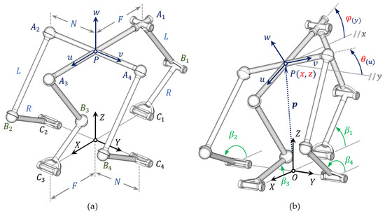 The revolute joints connected to the fixed platform are the active joints of the manipulator. Hence, the kinematic topology of the manipulator can be described as RRU-3RSS. As depicted in Figure 1, we use two reference frames. The fixed reference frame () is located at the center of the fixed platform, and the mobile reference frame () is attached to the mobile platform, with the w-axis normal to the platform plane and the -axis pointing towards point. Accordingly, the PM provides two translations () along - and -axes and two rotations ( and ) about - and -axes. Both output and input variables () are represented in Figure 1b.
