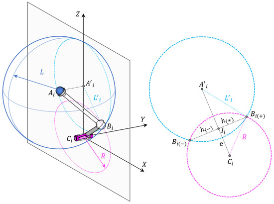 Nonetheless, the circumference-sphere intersection can be solved as an intersection of two circumferences, as shown in Figure 2. Hence, the approach applied to all KCs consists of solving the intersection points () between two circumferences (contained in planes) of center and , and radius and , respectively. is the projection of in the plane that contains the lower link of the -th KC.