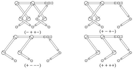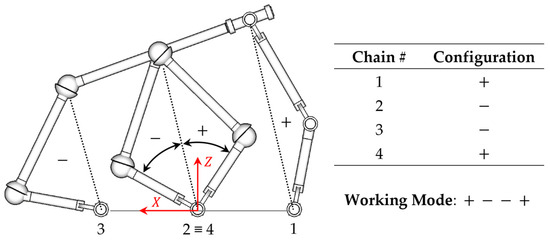 The sign in Equation (9) represents the two possible solutions of the inverse position problem for each KC independently. The set of possible solutions for the manipulator is also known as working modes. Since the RRU-3RSS manipulator has four KCs, there is a total of 16 (24) different working modes for the proposed PM. The notation used to identify the working modes is explained in Figure 3, where for each KC a or sign is chosen depending on its configuration, leading to a notation made up of four signs.