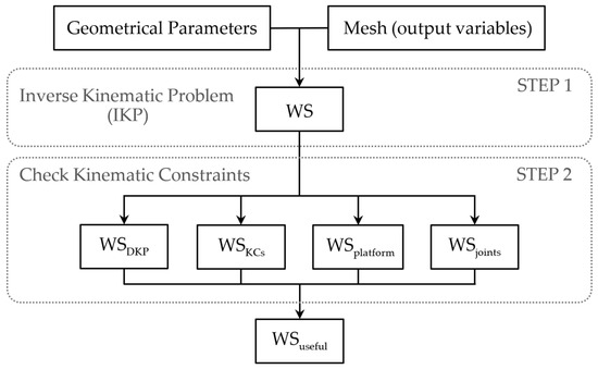There are different methods to calculate the WS of PMs, such as analytical methods, discretization methods or geometric methods [33]. In this paper, we use the discretization method to obtain and analyze the WSuseful. This method is implemented in MATLAB and has two main steps, as shown in Figure 5. In the first step, discrete poses of the end-effector are generated by means of a mesh in output variables ( and ). For each pose, the IKP is solved to verify whether the mechanism can be assembled in those poses or not. When the IKP has a solution, the discrete candidate pose belongs to the WS. In the second step, all poses belonging to the WS are subjected to a kinematic analysis, in which DKP singularities, physical limitation of the kinematic joints, existence of collisions and other types of constraints can be checked to analyze which poses belong to the WSuseful.