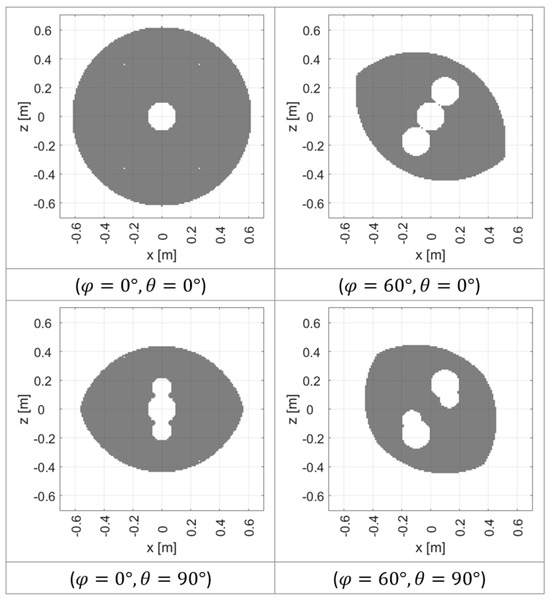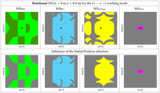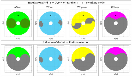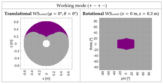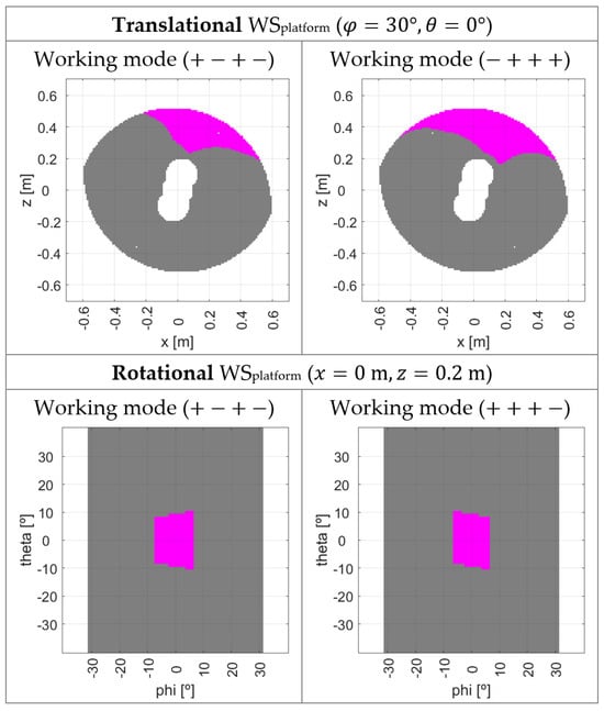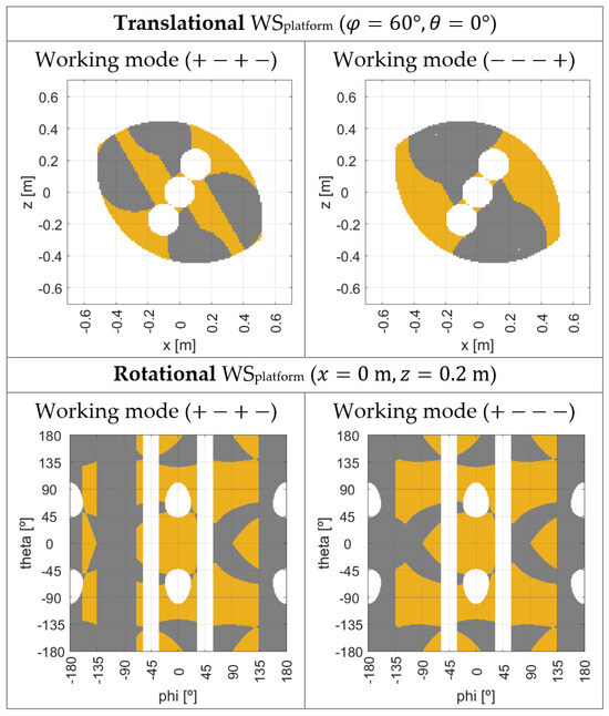 In Figure 18, some examples of the translational and rotational WSplatform are depicted for different working modes. For both Figure 16 and Figure 18, the non-gray areas colored in the plots represent the positions and orientations belonging to WSplatform.