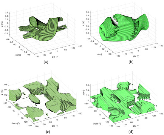 Unless the regions with the same sign of are connected in 4D space, the manipulator will only be able to work in a controlled manner inside one of them, which is given by the determinant of the Jacobian matrix at the initial position of the manipulator () (i.e., initial assembly mode). To check the connectivity between same-sign regions, a tridimensional representation can be used, wherein the regions with the same sign of are depicted for different values of a third output variable. In Figure 9, an example of this kind of representation for the () working mode is shown.