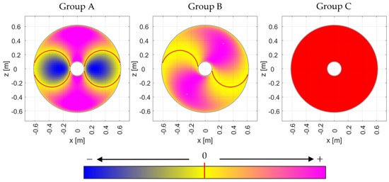 values inside the translational WS when the mobile platform is parallel to the fixed one () for the three groups of working modes (Group A, B and C).