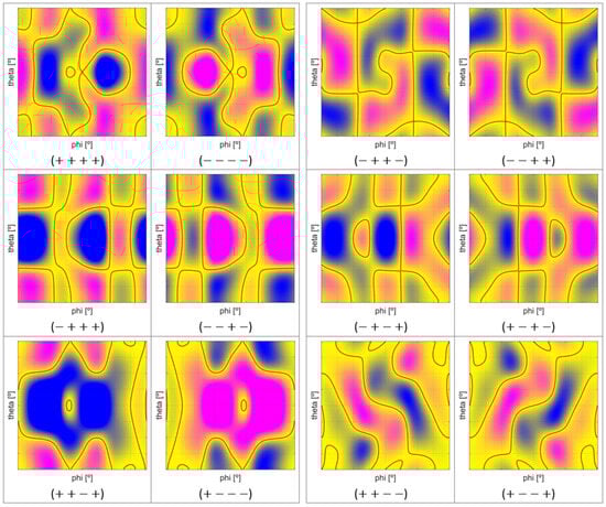 Mapping the sign of inside the WS is a common representation that provides a DKP singularity map. The boundaries between regions with opposite signs of coincide with the DKP singularity positions, as for a change in sign, a position with a zero value must be crossed. Figure 8 shows examples of this kind of representation, where the regions with the same color represent DKP singularity-free regions.