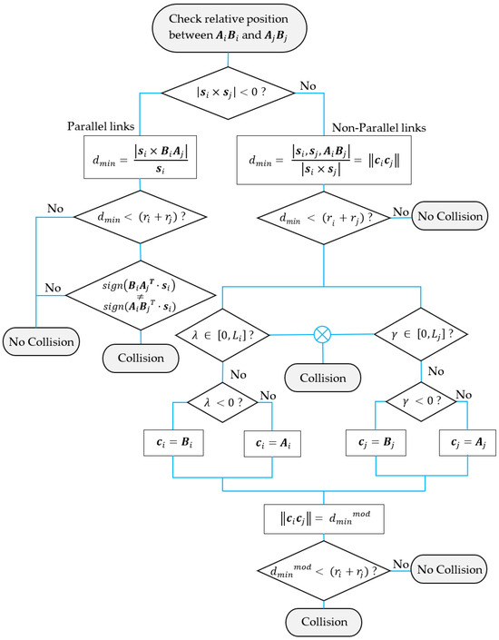 - Two cross-links: In Figure 1, the mobile platform consists of two cross-links. These two links coincide with the diagonals of a theoretical rhombus formed by the upper kinematic joints. Hence, the way to calculate the collisions of the KCs with the mobile platform is similar to the one carried out in Section 4.2.3 for WSKCs, but includes two new links with which collisions must be checked.