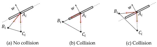 Schematic representation of (a) non-collision and (b,c) collision positions.