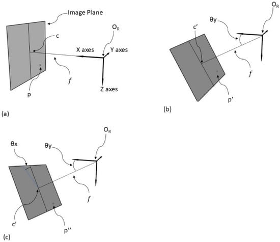 At this point, the position of the point p in the local coordinate systems should be defined, after the rotations defined by Euler angles. As shown in Figure 1a, the θz (Yaw angle) is always equal to zero. Therefore, both the position of point p and the orientation of the image plane, along with the center c, remain unaltered. The rotation of the coordinates of the point p due to Pitch (θy) can be then calculated using Ry (see Figure 1a and [22]).