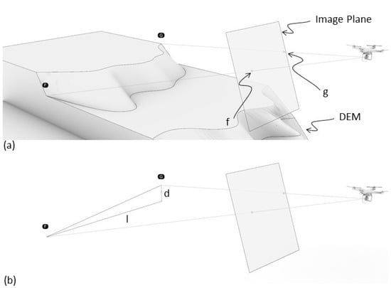 As proposed by [21], let us now consider two world points, G and F, in Figure 2a. Their world coordinates and can be obtained considering a Digital Elevation Model (DEM) in a coordinate system like UTM. These points can be used to calculate the horizontal distance between them (indicated with the letter l in Figure 2b) and the vertical distance between them (indicated with the letter d in Figure 1b).