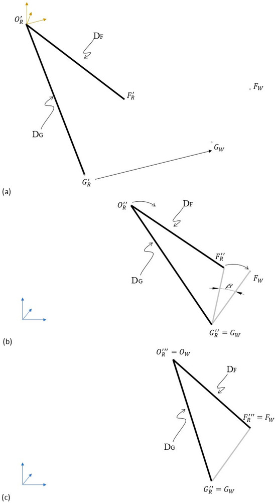 Three-dimensional graphical representation of the transformations applied to retrieve the location of the camera center in the world coordinates system. Points , , and , are translated considering the vector that goes from G′R to GW. Euclidean distances from to and to are called DG and DF, respectively. The relative coordinate system is indicated in light brown (a). The points generated after the translation are called , and In this condition, overlaps . Distances DG and DF and relative angles between the points remain the same. and are rotated by the angle β around the point . The world coordinate system is indicated in light blue (b). The rotation generates the point , which overlaps the world point Again, distances and relative angles between the points remain the same. The point is generated after the rotation is the wanted camera center in world coordinates (c).