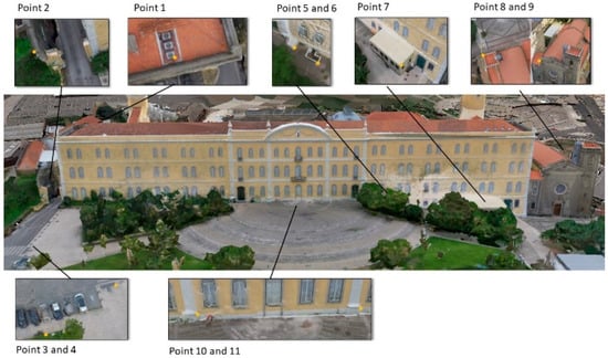 LiDAR model of the Colégio Almada Negreiros in Lisbon. This model was used to obtain the coordinates of 13 reference points used as reference for the calculations. The position in the 3D model and the localization of the points are shown in chips. The coordinates of the points are provided in Table 1.