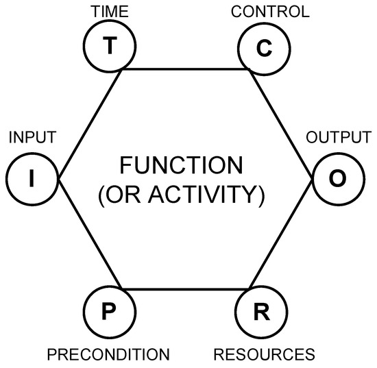 In synthesis, the method generally involves five key steps, starting from the definition of the objective of the analysis (e.g., the system’s risk analysis). Then, the system’s functions are identified, characterized, and described by means of the taxonomy and graphical representations suggested by Hollnagel [28]. In Figure 1, a scheme of FRAM’s hexagon or snowflake is illustrated, which represents a general function (or activity) of the investigated system.