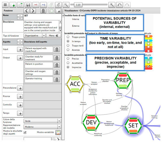 The further step concerned the analysis of the variability of each function: when the output of one function affects an aspect of another function, a coupling was established between them. An excerpt of the variability analysis of the Function SET (chamber closing and oxygen settings) is shown in Figure 3: the FRAM method was applied using the software FRAM Model Visualiser (FMV Pro, rel. 2.1.6 [65]) and the related FMV file is provided in the Supplementary Material.