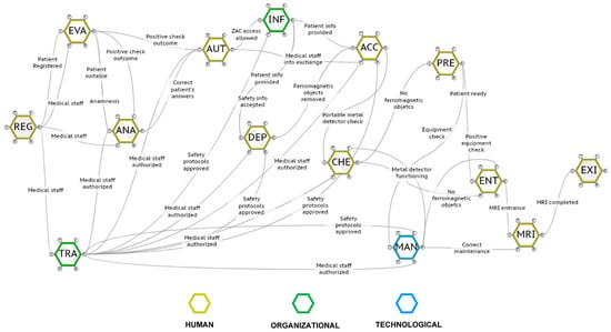 Besides these risks, other negative effects on the patient’s and operator’s health can be due to the RF field (which can lead to tissue heating) as well as the magnetic field gradients (which can lead to peripheral nerve stimulation and implant heating). The latter can also cause abnormal noise in the MRI scanner room that can lead to hearing damage [69]. To prevent these hazardous situations, the use of an MRI room is subject to strict safety requirements worldwide, where the Italian situation differs due to stricter regulations than the European Union ones [70]. Based on these safety requirements, the hospital issued an internal regulation that includes the use of a questionnaire that has to be filled out by the patient and checked by the MRI room manager before the patient is allowed to access the room for the diagnosis. Actually, the involuntary introduction of ferromagnetic objects into the MRI room or the entry of subjects with life-saving implantable medical devices has to be avoided. Hence, since the MRI room access represents a high-risk activity, we decided to analyze the procedures for accessing the MRI room by means of FRAM in order to identify where functional resonance phenomena could emerge and spread. It has to be noted that the MRI room is located inside a Controlled Access Zone (ZAC). Hence, the MRI unit consists of an acceptance zone, the ZAC, and the MRI room.