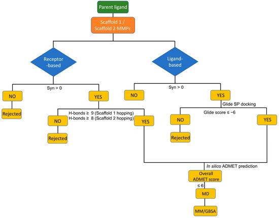 Scaffold hopping is a technique for finding isofunctional but structurally dissimilar chemical matter from libraries of diverse chemotypes that have been rationally designed [64]. In ligand-based scaffold hopping, the binding site of the protein is not taken into account during the screening step, and compounds with novel core motifs are identified that are predicted to have similar biological activities to the template. Ligand-based scaffold hopping is a widely used virtual screening technique in modern drug discovery that is usually faster than receptor-based scaffold hopping [64,65,66,67]. However, it is also crucial to understand how compounds interact with the protein of interest. When information about the binding site is available, receptor-based scaffold hopping allows the identification of novel chemotypes that can interact strongly with the protein [68,69]. Conceptually, ligand-based screening can generate a higher number of potential hits, while receptor-based screening can help to eliminate false positives. Combining both strategies can help in compound optimization with the aim of improving target binding, ensuring drug-like properties, or reducing toxicity [69,70]. In this study, we have applied the two screening approaches in parallel to maximize our chances to find hits. A larger number of potential hits having a synthesizability score >0 were obtained from ligand-based screening (1115 from Scaffold 1 hopping and 1109 from Scaffold 2 hopping) compared with receptor-based scaffold hopping (29 from Scaffold 1 hopping and 9 from Scaffold 2 hopping; these structures also satisfied a cut-off criterion of the number of hydrogen bonding interactions with the protein binding pocket). We then used global machine-learning models for pharmacokinetic property prediction, with the aim of obtaining drug-like hits.