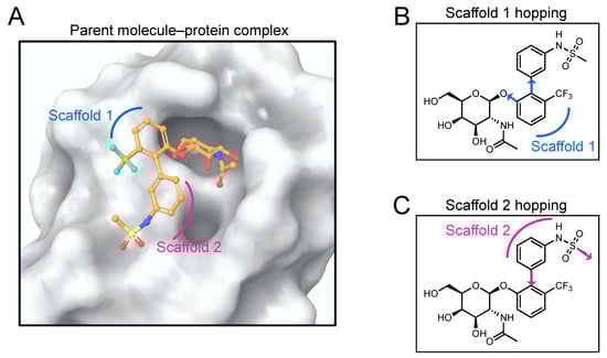 The hit molecule is a combination of a glycone (GalNAc) and an aglycone fragment. The aglycone fragment can further be considered to be composed of two scaffolds (Figure 2A). In this work, we performed scaffold hopping for each of the scaffolds, the central moiety (Scaffold 1), and the terminal moiety (Scaffold 2). Scaffold hopping is an extensively used computer-aided approach to search for active compounds that contain different core structural features. It is utilized in the design of compounds that are structurally significantly different than the parent compound but that are similar enough to exhibit similar or improved biological properties relative to those of the parent compound [31,32].